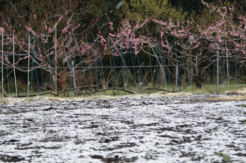 桃の花が雪景色の中にあるやないの。えらいこっちゃ!!