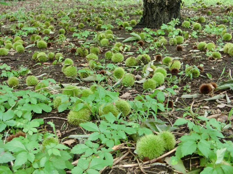 茶色に熟したら収穫するはずだったのに、緑の未熟な状態で大量に落下。