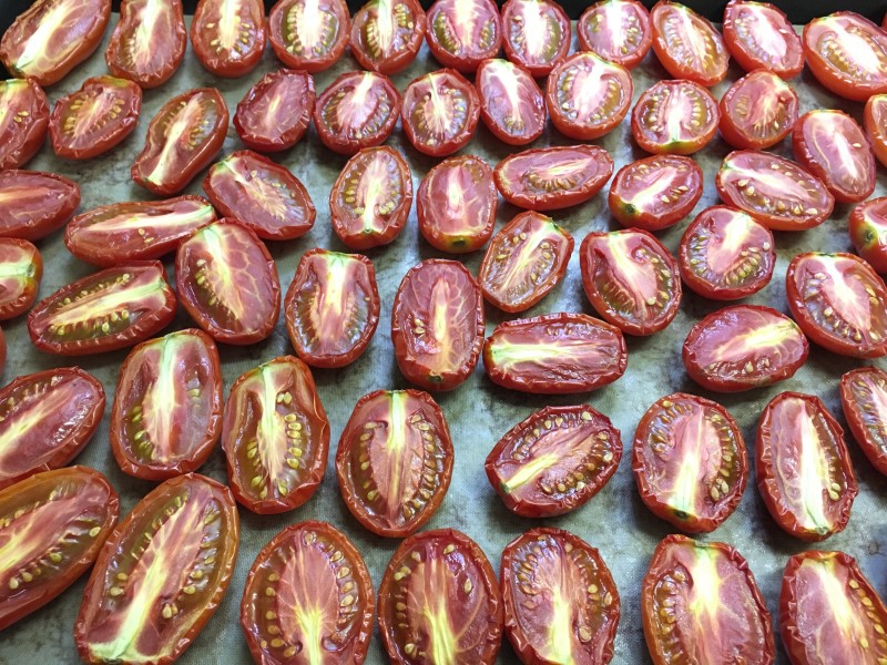 午後は、畑で育てたミニトマトでセミドライトマトをつくる。