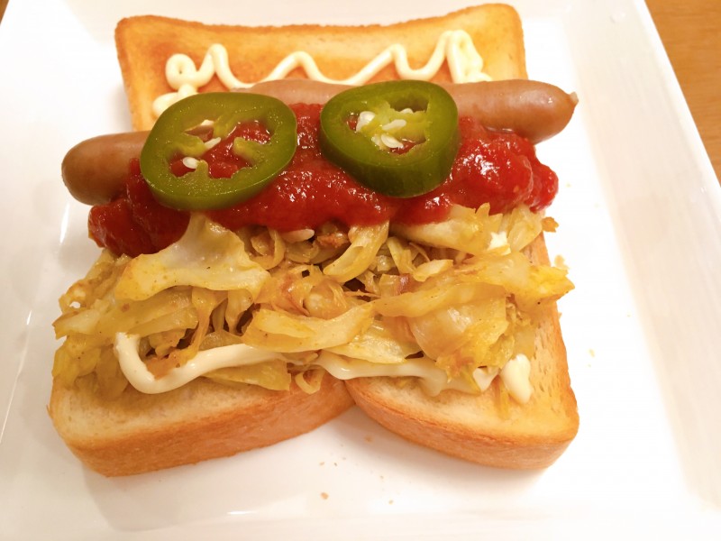 ③パンをトーストして、少しマヨネーズを塗り、キャベツ、ソーセージを乗せて、上に私のケチャップを。