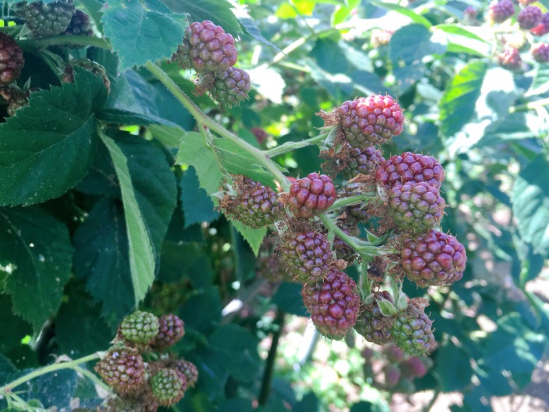 雨の合間に初物のブラックベリーを収穫。