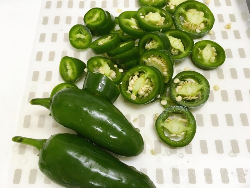 ハラペーニョを切るときは、まな板の上にまな板シートを敷かないと、まな板が辛くなる。手袋は必須。
