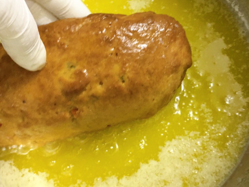 焼き上がった熱々のシュトレンを、バターのお風呂に浸けているところ。