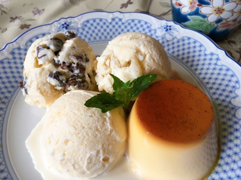 バニラアイス、バナナアイス、酒入れすぎラムレーズンアイスのプリンアラモード。やりたい放題だな。(これが朝ごはん。大人って最高。)