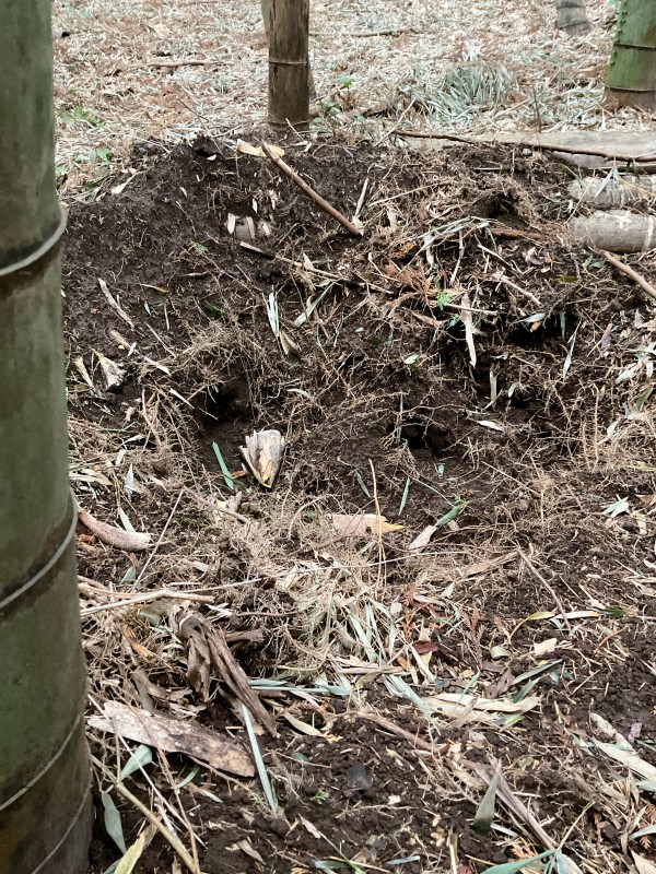 今週ずっと降り続いた雨のおかげで筍が動き始めたかなと見に行った家族が、イノシシすごいぞって。