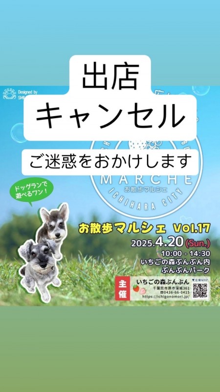 体調不良のため、明日のいちごの森ぶんぶんおさんぽマルシェは出店キャンセルします。