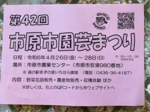 4月後半のイベント出店と休みのお知らせ 4/26(金)〜28(日) 9時〜15時 市原市園芸まつりに出店します。 場所は市原市農業センター (道の駅あずの里いちはらに隣接) イベント出店前後に休みをいただきます。 4/2 […]